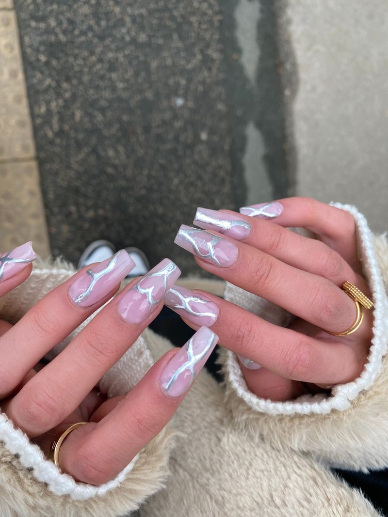 Chrome flakes suspended in glass gel create the most eye-catching metallic effect I’ve ever worn. Unlike regular chrome powder, these irregular flakes catch and reflect light from multiple angles, looking like shattered mirrors trapped in ice.