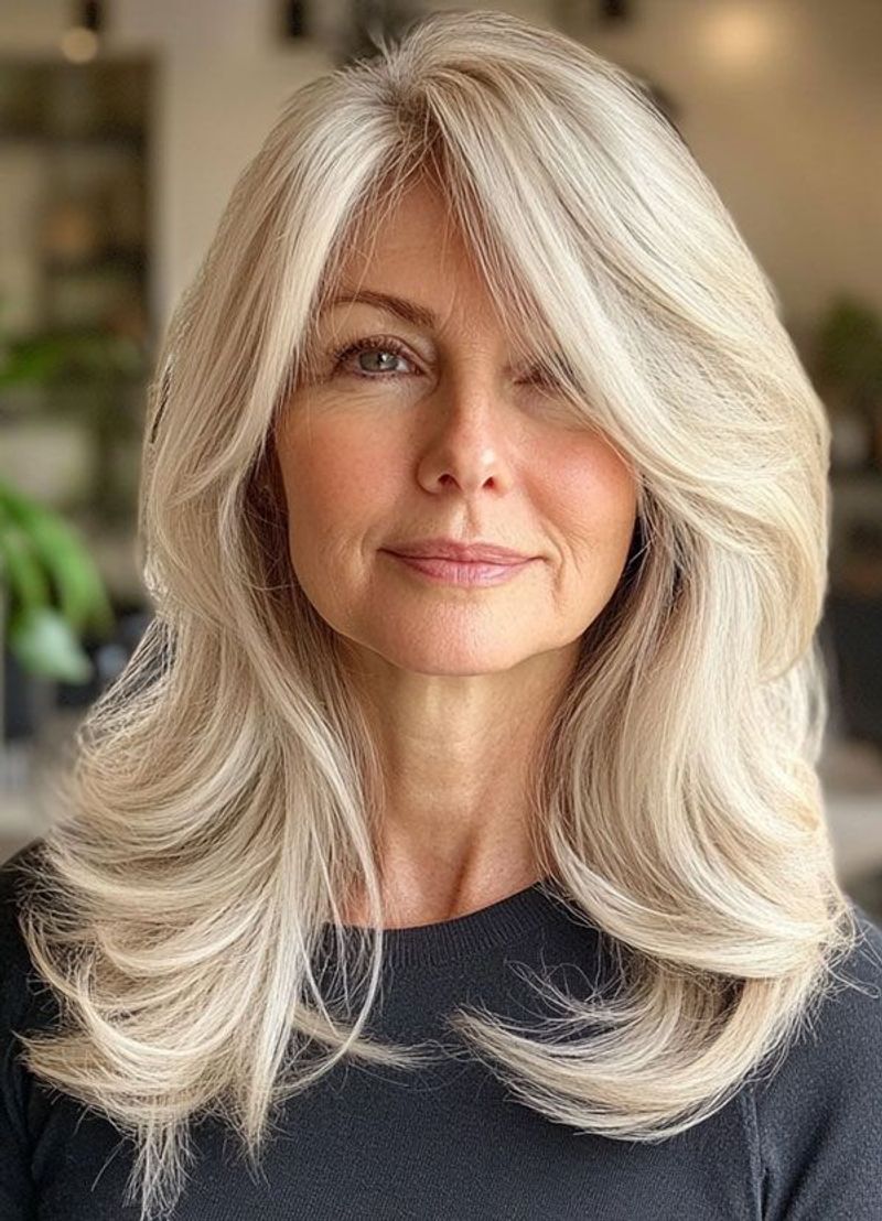 Curtain bangs have made a major comeback, and they pair beautifully with long layers for women over 50. These face-framing bangs part in the middle and sweep to the sides, softening features without hiding them.