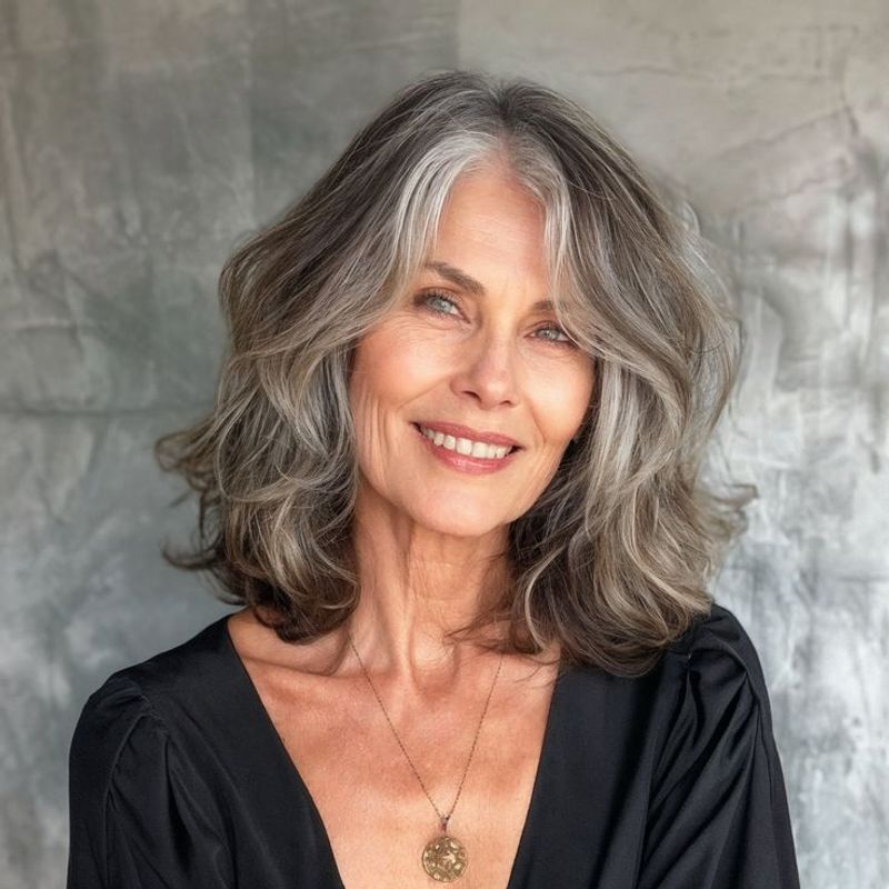 Embracing natural gray or silver hair is one of the most empowering choices women over 60 can make. Paired with soft waves in a mid-length cut, it creates a look that’s both authentic and beautiful. The gentle movement of waves adds dimension to silver hair that might otherwise fall flat.